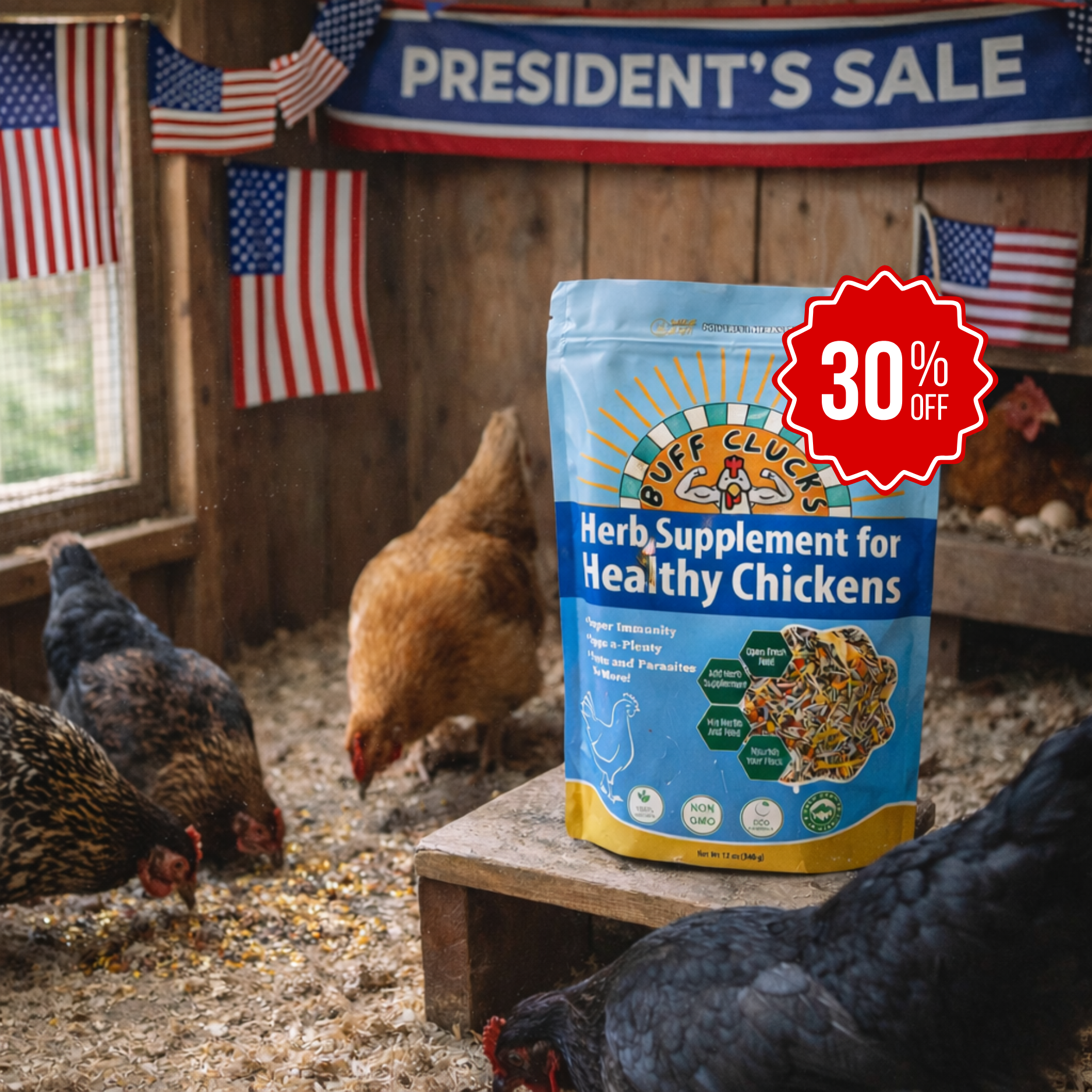 Pests and parasites will take a hike when Buff Clucks is on duty leaving your backyard chicken coop fresh and safe.