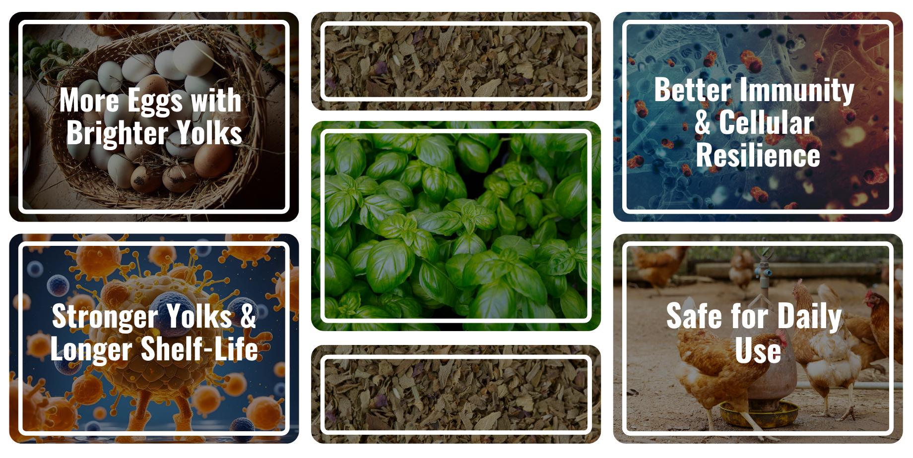 Science shows that basil supports egg production, enhances yolk color, and protects your hens at the cellular level with powerful antioxidants.