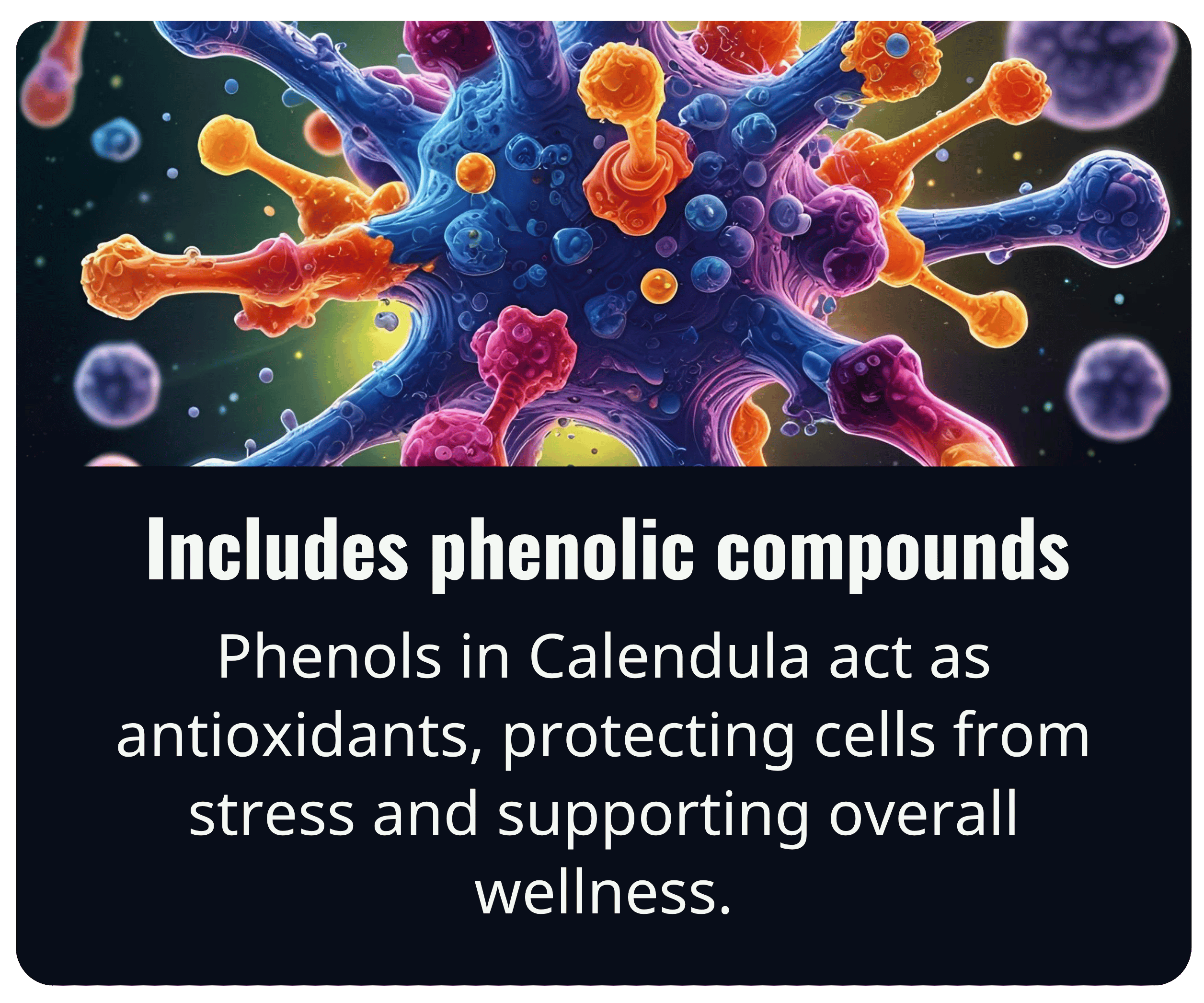The flavonoids and saponins inside Calendula help strengthen their immune system and keep harmful bacteria under control, while its phenolic compounds act like tiny shields that protect cells from stress and sickness.