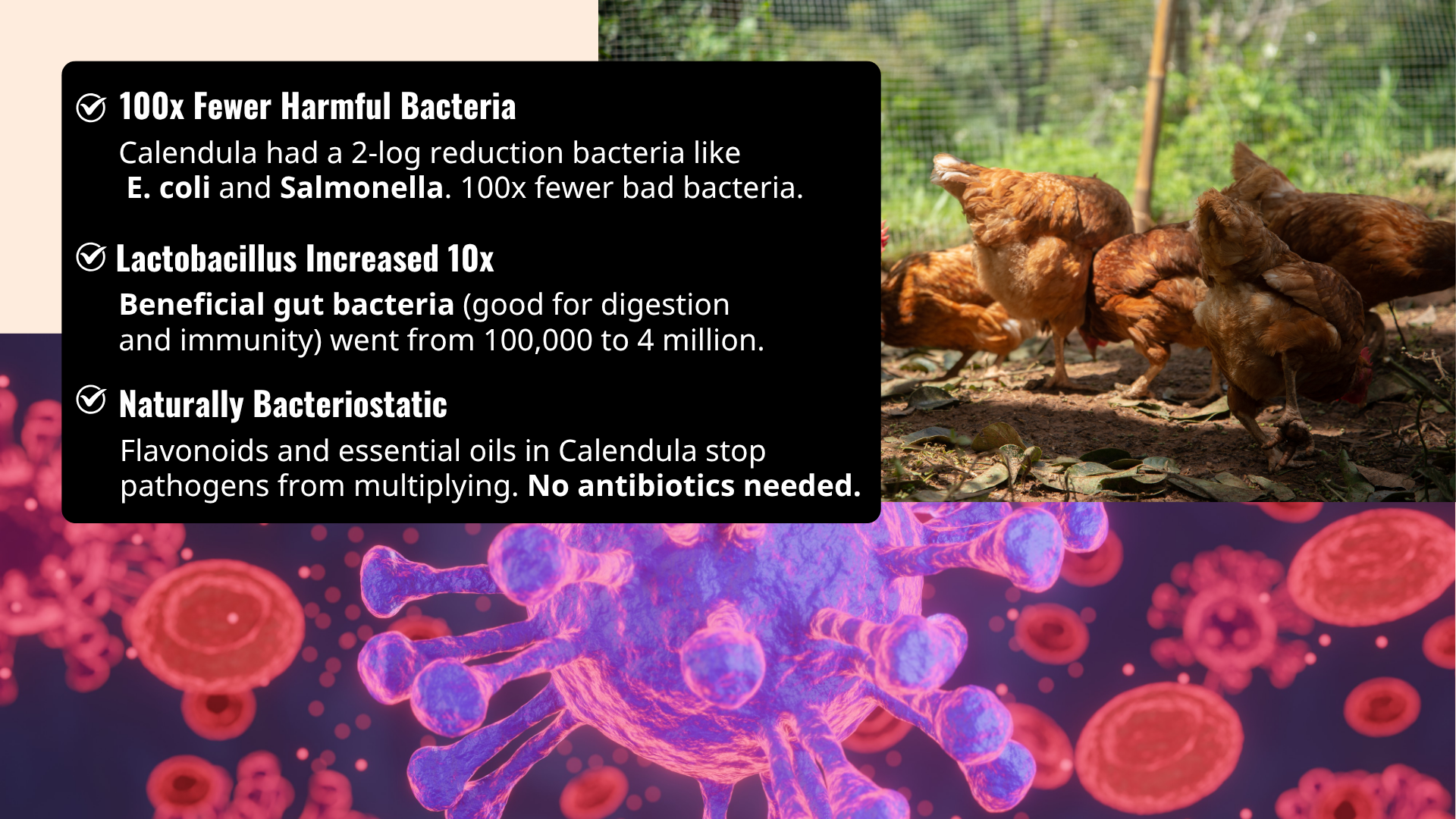 In simple terms, Calendula keeps your chickens’ tummies clean and strong—no antibiotics required. Studies show that it can reduce harmful bacteria by up to 100x and boost good gut microbes by 10x, creating a healthier, more resilient flock.
