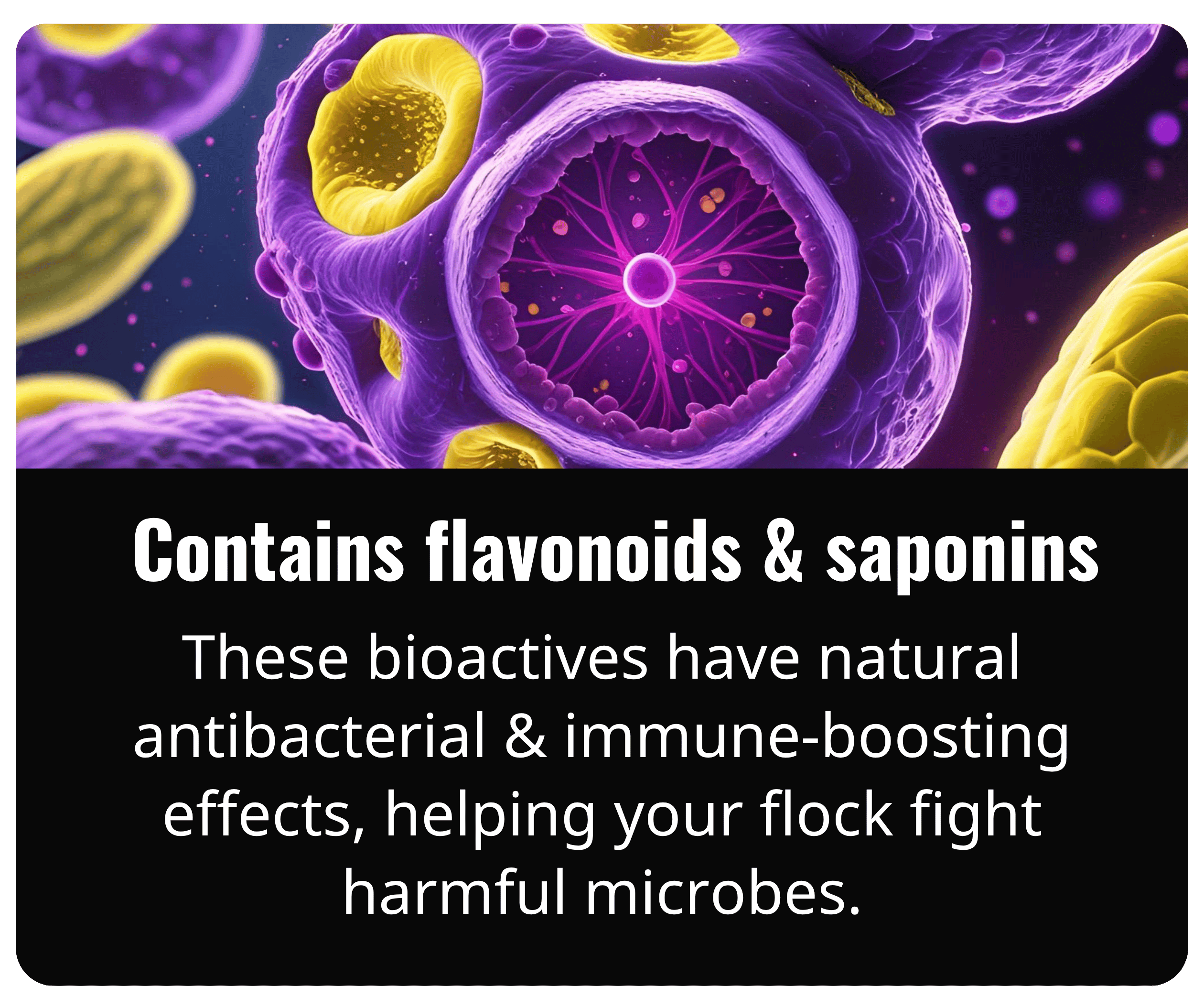 Your chickens’ health starts in their gut and Calendula helps keep it in top shape. It works in two powerful ways: by reducing harmful bacteria that cause disease, and by increasing good bacteria that aid digestion and immunity. No antibiotics, just plants doing their job.
