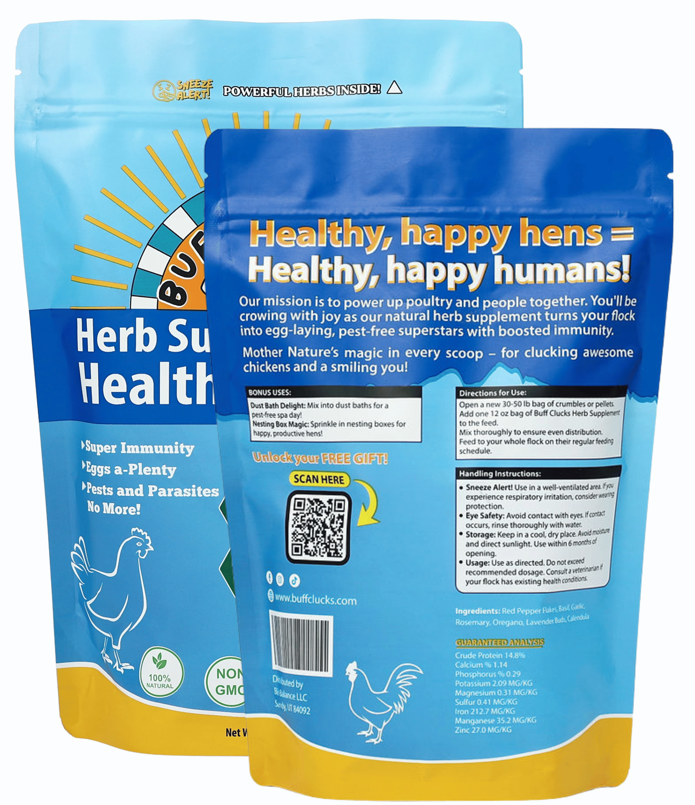 Feeding your flock the good stuff shouldn’t be complicated, and Buff Clucks makes it effortless. Just mix it into your regular feed and let the research-backed herbs do the heavy lifting for immunity, digestion, and overall vitality. It’s the quickest daily upgrade for healthier hens and better eggs.