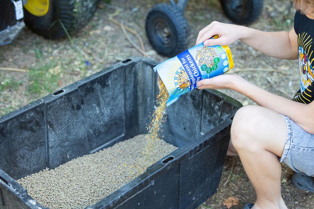 Add one 12 oz bag (or 1 quart) of Buff Clucks Herb Supplement into a 30–50 lb bag of poultry feed. Stir or shake well to create a month’s worth of upgraded nutrition for up to eight hens.