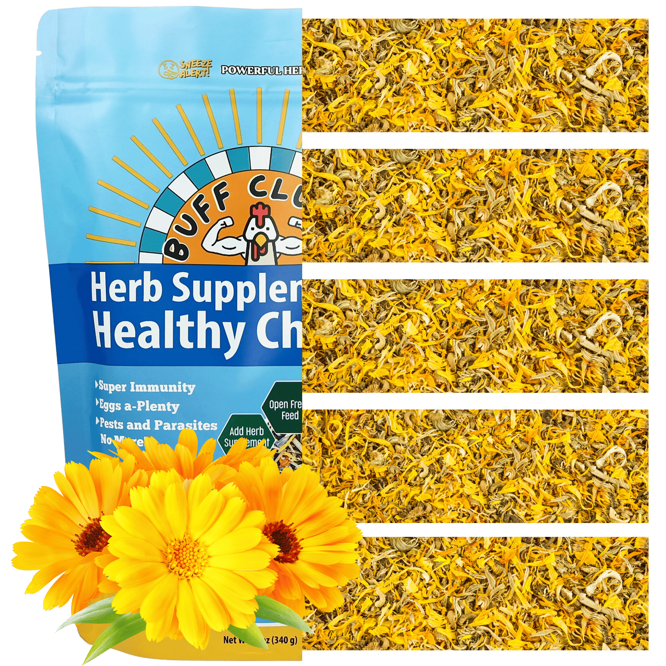 Every scoop of Buff Clucks Herb Supplement contains calendula for a reason. Think of calendula as nature’s secret for happier, healthier hens.