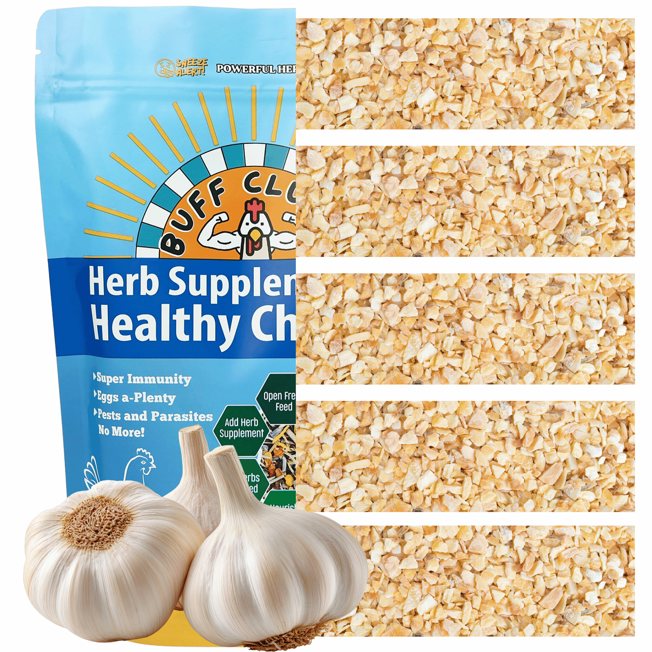 Then you’ll want to see why garlic is one of the most powerful ingredients in the Buff Clucks Herb Supplement. In our Herb Supplement, we chose real, dried garlic because study show it repels parasites, supports gut health and improves egg production.
