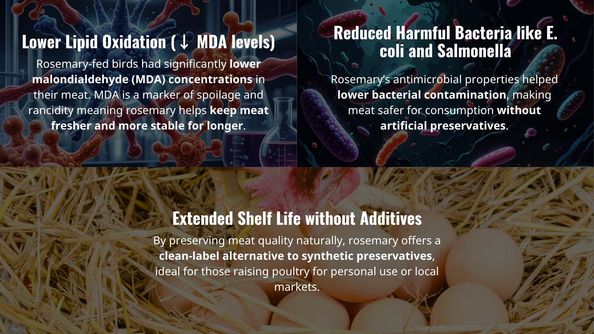 By preserving meat quality naturally, rosemary offers a clean-label alternative to synthetic preservatives, ideal for those raising poultry for personal use or local markets.